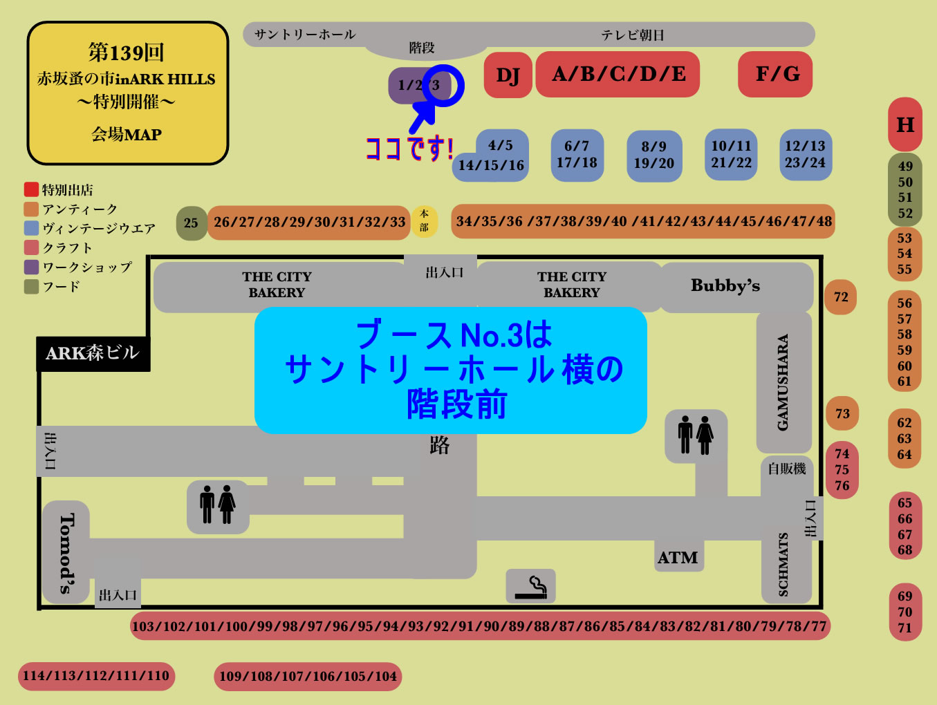 なお今回ブースNo.3でサントリーホール横の半円階段付近で開催します。