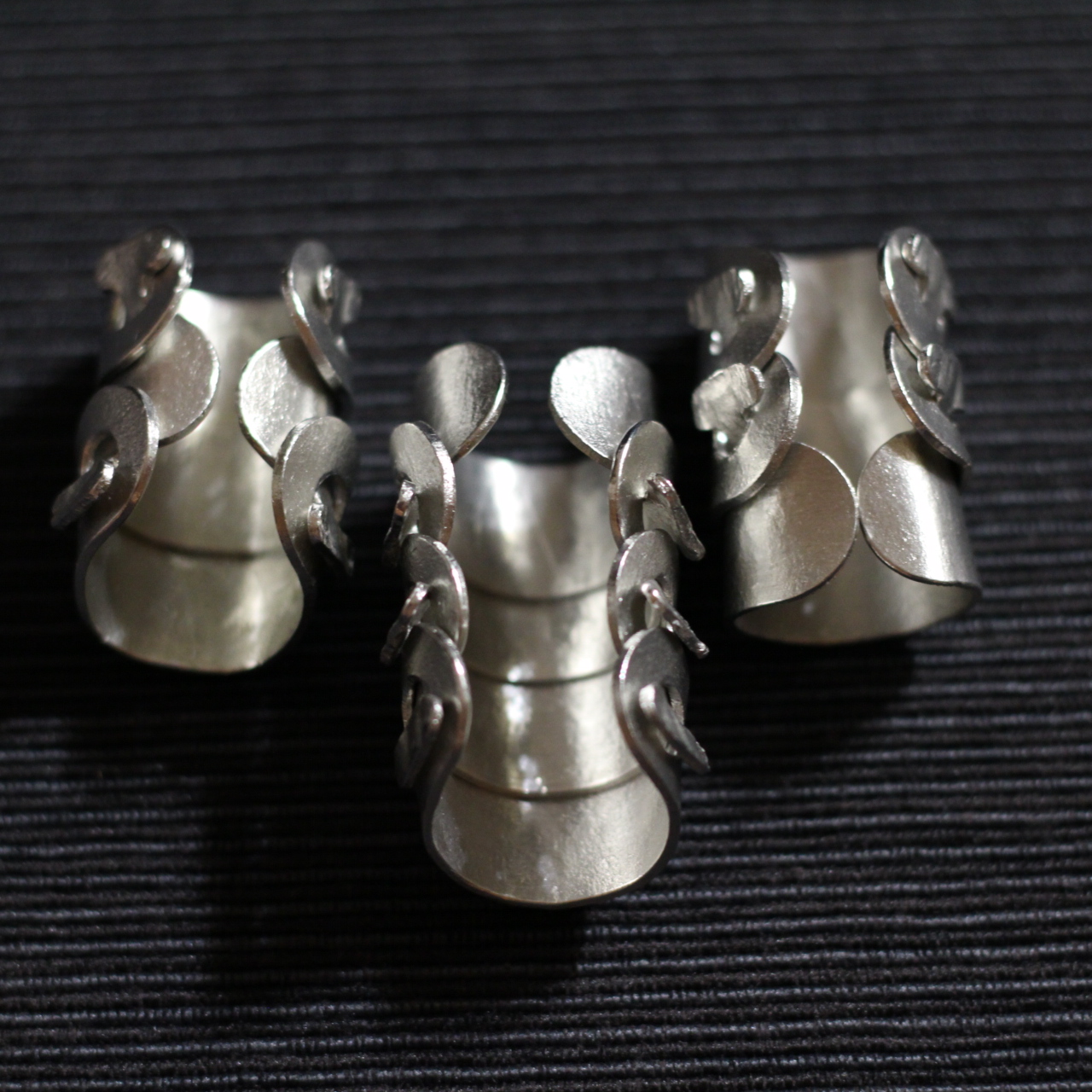 しおり状の錫板4枚を鋳造し、各々加工した後に重なるように繋げると、接合部が鎧のようなディテールのリングが出来上がります。